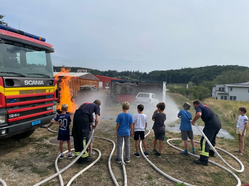 kennenlernen aller Fahrzeuge. Danach hiess es für die Grossen Aufsitzen auf zwei Mannschaftstransporter und Verschiebung zum Brandcontainer. Dort durften die Kinder unter fachkundiger Anleitung erfahrener Feuerwehrmänner richtiges Feuer löschen.